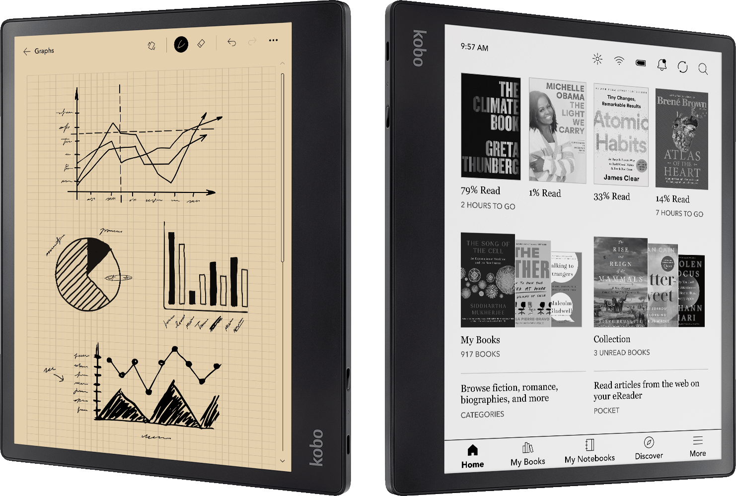 Find millions of eBooks in the Kobo eBookstore right on Kobo Elipsa 2E. Kobo Elipsa 2E has 32GB** of storage, so you’ll always have room for your eBooks, Kobo Audiobooks, and every note and idea. Its long battery life is just as impressive, offering up to weeks of power†† on a single charge.